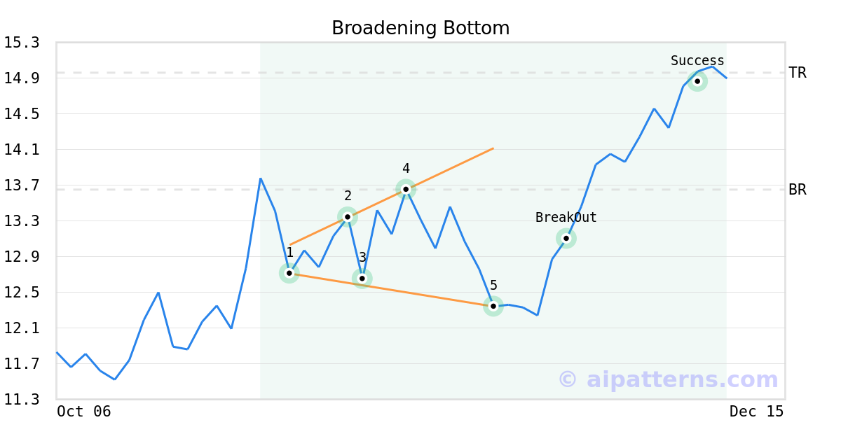 On November 17, 2025, A.I.dvisor detected a Broadening Bottom Pattern (Bullish) for American Airlines Group (AAL, $12.34). On November 24, 2025, A.I.dvisor confirmed the Bullish pattern, setting a target price of $14.96. 14 days later, on December 08, 2025, AAL reached the target price resulting in a +2 for traders who took a long position in the stock.