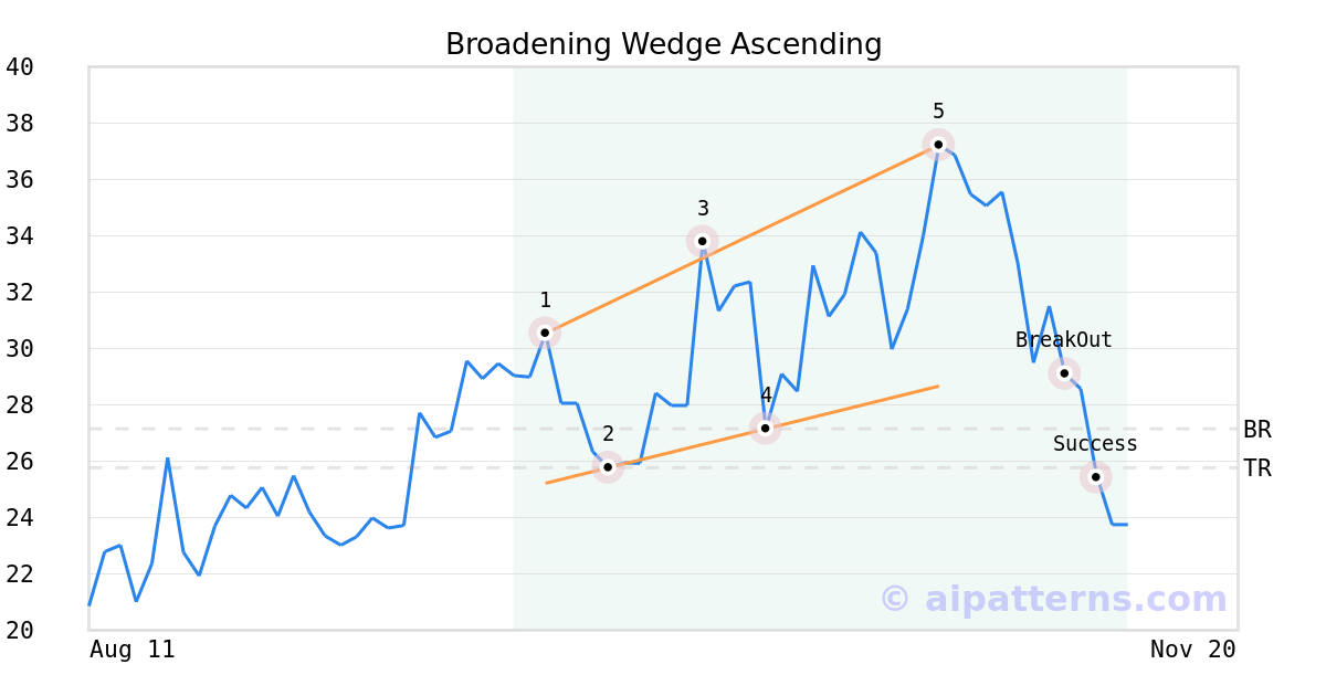On October 27, 2025, A.I.dvisor detected a Broadening Wedge Ascending Pattern (Bearish) for Applied Optoelectronics (AAOI, $37.22). 10 days later, on November 06, 2025, A.I.dvisor confirmed the Bearish pattern, setting a target price of the stock. On November 10, 2025, the stock hit the target price of $25.77 – resulting in a +3 gain for traders who shorted the stock on the pattern detection date.