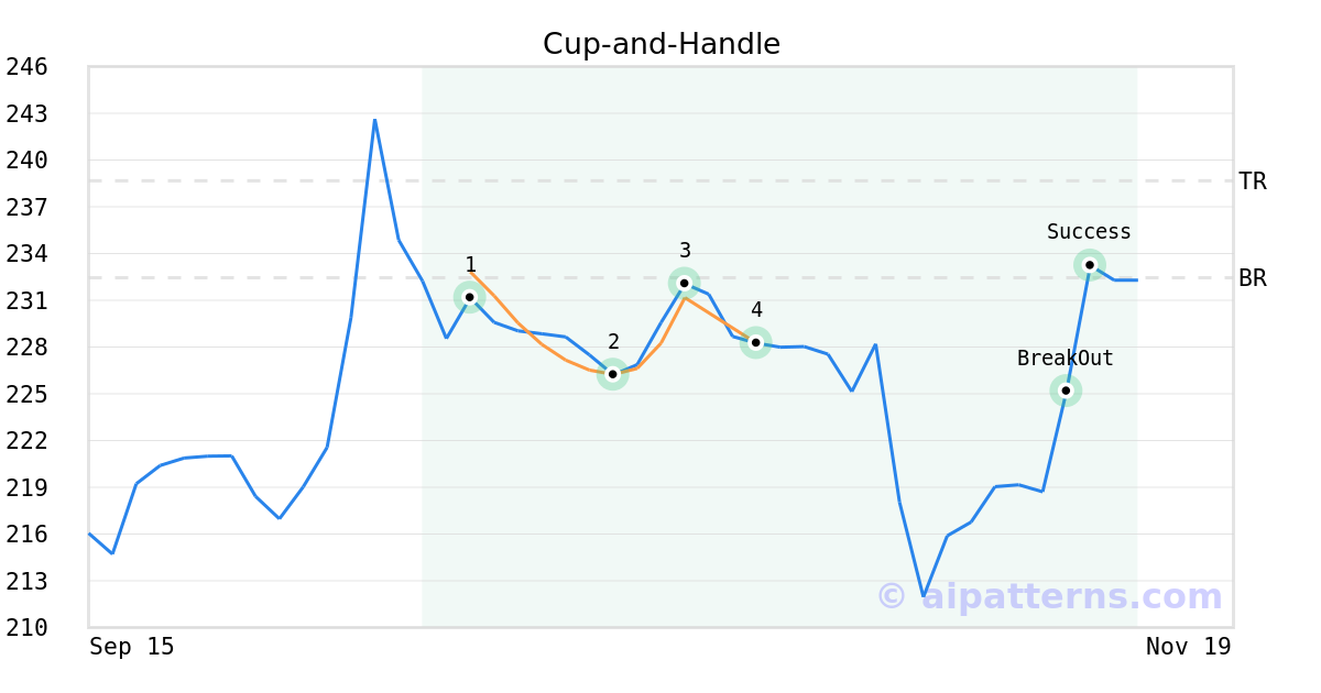 On October 23, 2025, A.I.dvisor detected a Cup-and-Handle Pattern (Bullish) for ABBVIE (ABBV, $228.25). On November 11, 2025, A.I.dvisor confirmed the Bullish pattern, setting a target price of $238.67. 1 day later, on November 12, 2025, ABBV reached the target price resulting in a for traders who took a long position in the stock.
