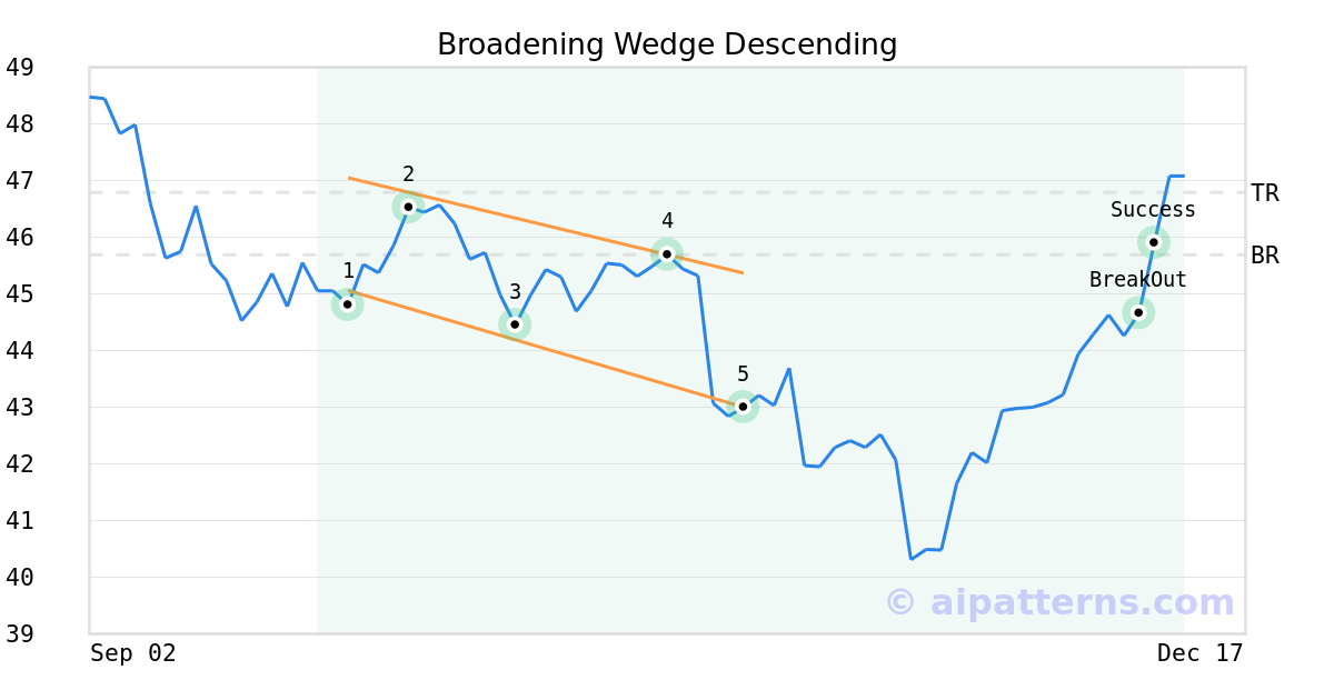 On October 31, 2025, A.I.dvisor detected a Broadening Wedge Descending Pattern (Bullish) for ABM Industries (ABM, $43.00). On December 09, 2025, A.I.dvisor confirmed the Bullish pattern, setting a target price of $46.79. 1 day later, on December 10, 2025, ABM reached the target price resulting in a for traders who took a long position in the stock.