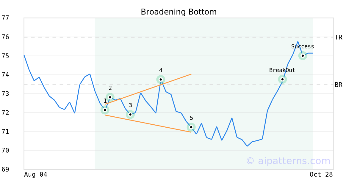 On September 19, 2025, A.I.dvisor detected a Broadening Bottom Pattern (Bullish) for Agree Realty Corp (ADC, $70.96). On October 15, 2025, A.I.dvisor confirmed the Bullish pattern, setting a target price of $75.98. 6 days later, on October 21, 2025, ADC reached the target price resulting in a for traders who took a long position in the stock.