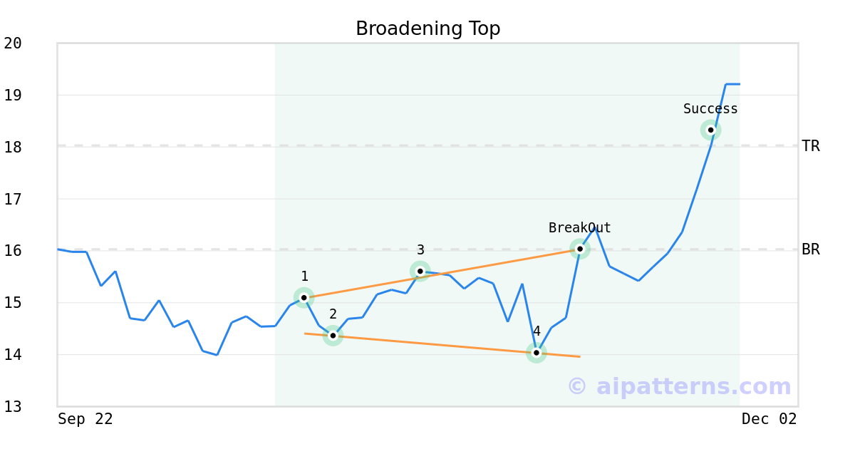 On November 11, 2025, A.I.dvisor detected a Broadening Top Pattern (Bullish) for ADMA Biologics (ADMA, $16.03). On November 11, 2025, A.I.dvisor confirmed the Bullish pattern, setting a target price of $18.03. 13 days later, on November 24, 2025, ADMA reached the target price resulting in a +1 for traders who took a long position in the stock.