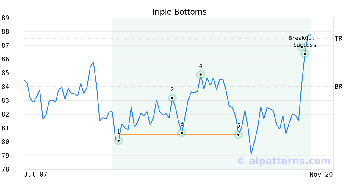On October 10, 2025, A.I.dvisor detected a Triple Bottoms Pattern (Bullish) for Assured Guaranty Ltd (AGO, $80.51). On November 07, 2025, A.I.dvisor confirmed the Bullish pattern, setting a target price of $87.52. 3 days later, on November 10, 2025, AGO reached the target price resulting in a for traders who took a long position in the stock.