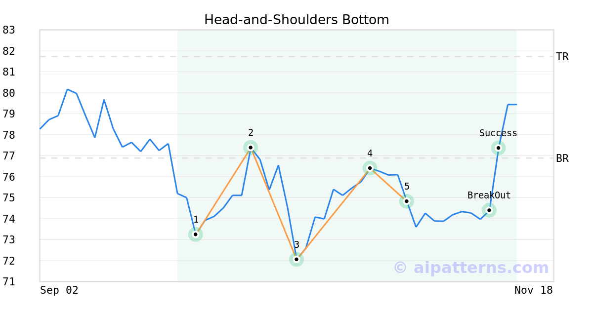 On October 28, 2025, A.I.dvisor detected a Head-and-Shoulders Bottom Pattern (Bullish) for Alcon (ALC, $74.82). On November 10, 2025, A.I.dvisor confirmed the Bullish pattern, setting a target price of $81.73. 1 day later, on November 11, 2025, ALC reached the target price resulting in a for traders who took a long position in the stock.