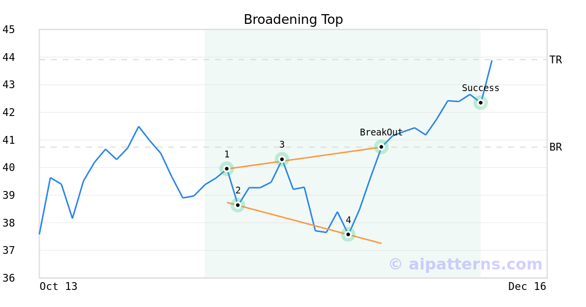 On November 25, 2025, A.I.dvisor detected a Broadening Top Pattern (Bullish) for Ally Financial (ALLY, $40.74). On November 25, 2025, A.I.dvisor confirmed the Bullish pattern, setting a target price of $43.91. 14 days later, on December 09, 2025, ALLY reached the target price resulting in a for traders who took a long position in the stock.