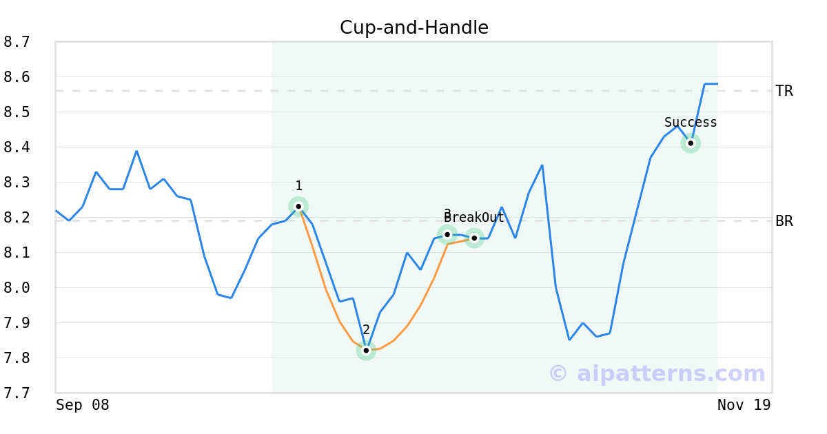 On October 21, 2025, A.I.dvisor detected a Cup-and-Handle Pattern (Bullish) for Amcor plc (AMCR, $8.14). On October 21, 2025, A.I.dvisor confirmed the Bullish pattern, setting a target price of $8.56. 22 days later, on November 12, 2025, AMCR reached the target price resulting in a for traders who took a long position in the stock.