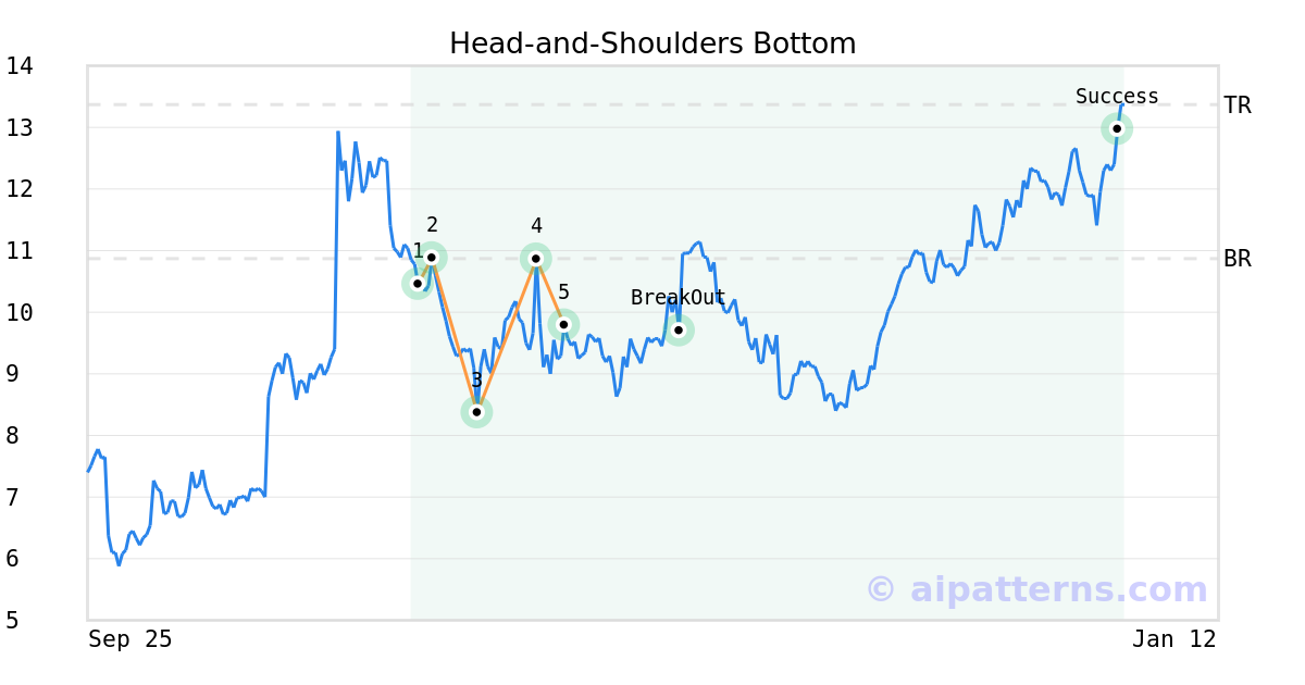 On April 14, 2025, A.I.dvisor detected a Head-and-Shoulders Bottom Pattern (Bullish) for AngioDynamics (ANGO, $9.79). On June 02, 2025, A.I.dvisor confirmed the Bullish pattern, setting a target price of $13.37. 182 days later, on December 01, 2025, ANGO reached the target price resulting in a +3 for traders who took a long position in the stock.