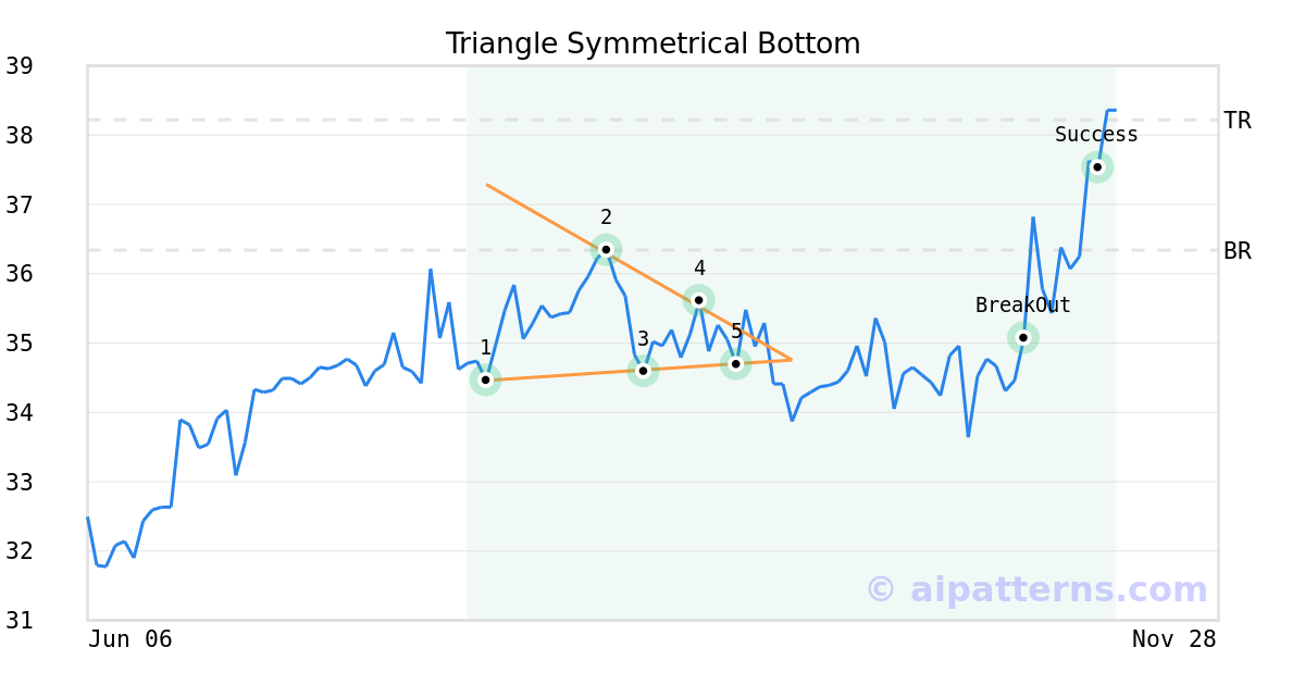 On September 17, 2025, A.I.dvisor detected a Triangle Symmetrical Bottom Pattern (Bullish) for APi Group Corporation (APG, $34.69). On October 30, 2025, A.I.dvisor confirmed the Bullish pattern, setting a target price of $38.22. 12 days later, on November 11, 2025, APG reached the target price resulting in a for traders who took a long position in the stock.