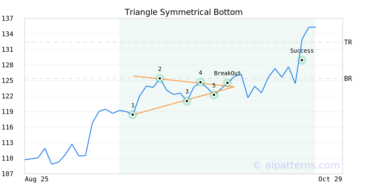 On October 03, 2025, A.I.dvisor detected a Triangle Symmetrical Bottom Pattern (Bullish) for Amphenol Corp (APH, $122.22). On October 07, 2025, A.I.dvisor confirmed the Bullish pattern, setting a target price of $132.39. 15 days later, on October 22, 2025, APH reached the target price resulting in a for traders who took a long position in the stock.