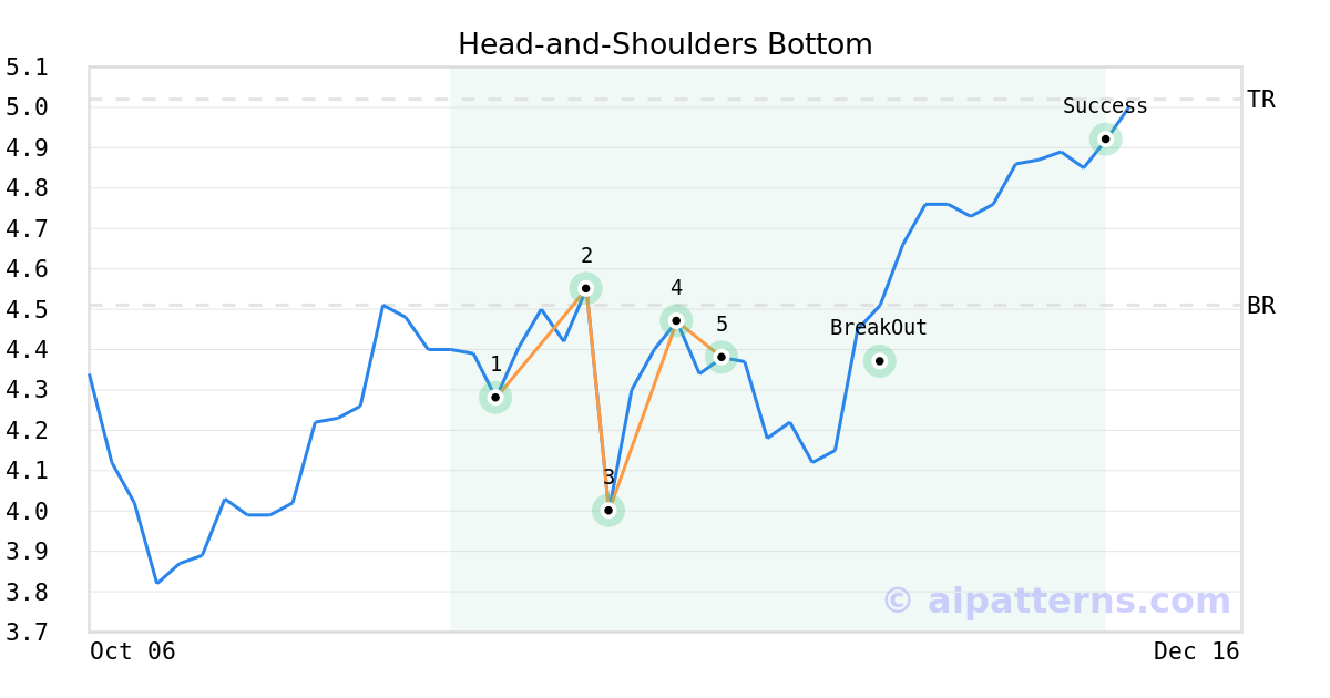 On November 13, 2025, A.I.dvisor detected a Head-and-Shoulders Bottom Pattern (Bullish) for ARKO Corp (ARKO, $4.38). On November 24, 2025, A.I.dvisor confirmed the Bullish pattern, setting a target price of $5.02. 15 days later, on December 09, 2025, ARKO reached the target price resulting in a +1 for traders who took a long position in the stock.