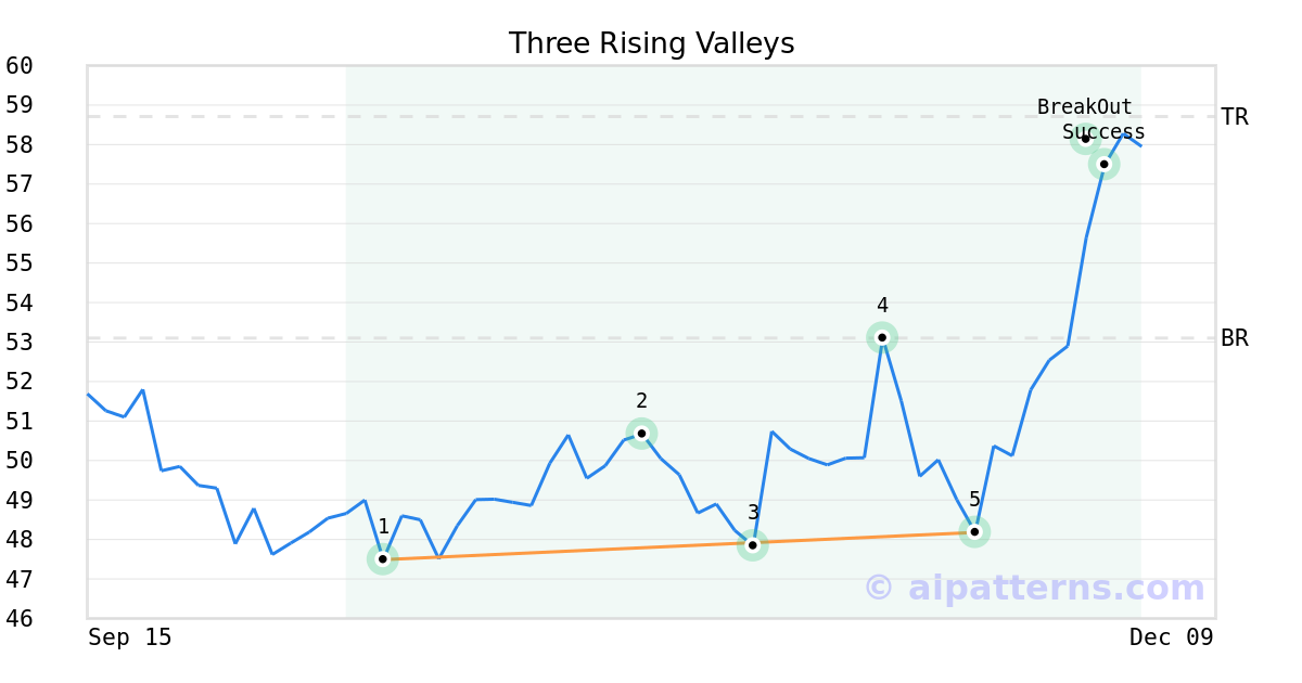 On November 20, 2025, A.I.dvisor detected a Three Rising Valleys Pattern (Bullish) for Ashland (ASH, $48.18). On December 01, 2025, A.I.dvisor confirmed the Bullish pattern, setting a target price of $58.71. 1 day later, on December 02, 2025, ASH reached the target price resulting in a +1 for traders who took a long position in the stock.