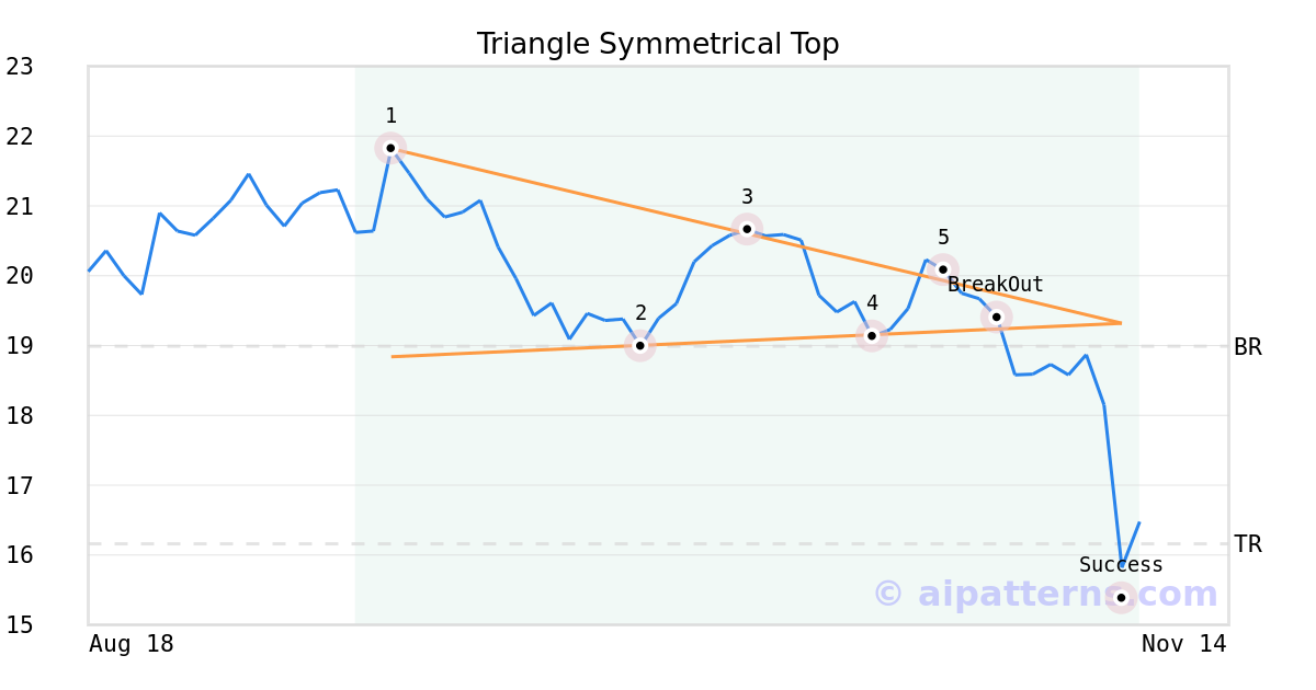 On October 24, 2025, A.I.dvisor detected a Triangle Symmetrical Top Pattern (Bearish) for AdvanSix (ASIX, $20.08). 5 days later, on October 29, 2025, A.I.dvisor confirmed the Bearish pattern, setting a target price of the stock. On November 07, 2025, the stock hit the target price of $16.16 – resulting in a +2 gain for traders who shorted the stock on the pattern detection date.
