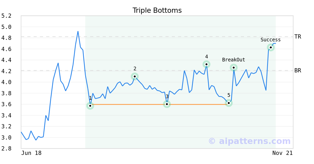 On October 17, 2025, A.I.dvisor detected a Triple Bottoms Pattern (Bullish) for Athira Pharma Inc. (ATHA, $3.62). On October 21, 2025, A.I.dvisor confirmed the Bullish pattern, setting a target price of $4.82. 21 days later, on November 11, 2025, ATHA reached the target price resulting in a +2 for traders who took a long position in the stock.