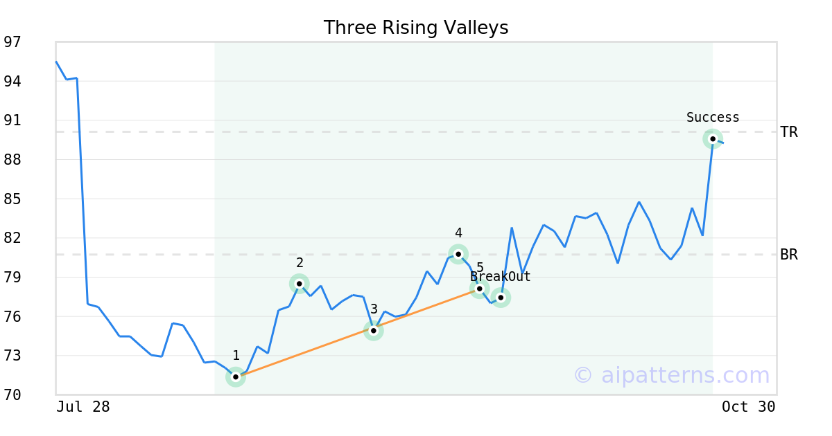 On September 23, 2025, A.I.dvisor detected a Three Rising Valleys Pattern (Bullish) for ATI (ATI, $78.09). On September 25, 2025, A.I.dvisor confirmed the Bullish pattern, setting a target price of $90.12. 28 days later, on October 23, 2025, ATI reached the target price resulting in a +1 for traders who took a long position in the stock.
