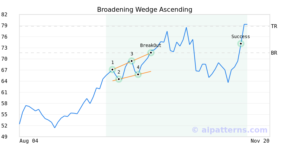On October 01, 2025, A.I.dvisor detected a Broadening Wedge Ascending Pattern (Bullish) for AngloGold Ashanti plc (AU, $71.67). On October 01, 2025, A.I.dvisor confirmed the Bullish pattern, setting a target price of $78.82. 40 days later, on November 10, 2025, AU reached the target price resulting in a for traders who took a long position in the stock.