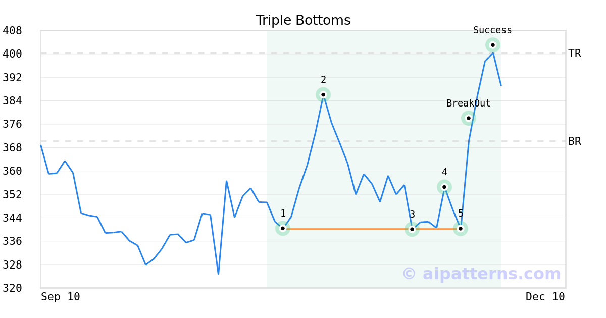On November 21, 2025, A.I.dvisor detected a Triple Bottoms Pattern (Bullish) for Broadcom Inc. (AVGO, $340.20). On November 24, 2025, A.I.dvisor confirmed the Bullish pattern, setting a target price of $400.24. 4 days later, on November 28, 2025, AVGO reached the target price resulting in a +1 for traders who took a long position in the stock.