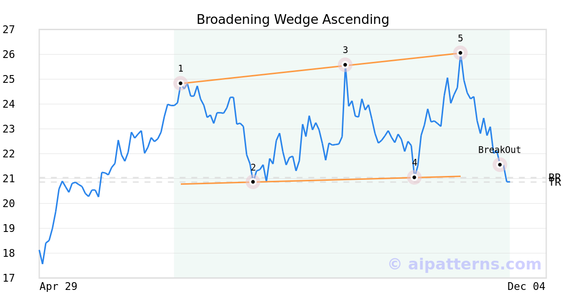 On October 30, 2025, A.I.dvisor detected a Broadening Wedge Ascending Pattern (Bearish) for Aviat Networks (AVNW, $26.05). 18 days later, on November 17, 2025, A.I.dvisor confirmed the Bearish pattern, setting a target price of the stock. On November 17, 2025, the stock hit the target price of $20.86 – resulting in a +1 gain for traders who shorted the stock on the pattern detection date.