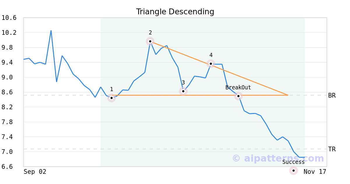 On October 27, 2025, A.I.dvisor detected a Triangle Descending Pattern (Bearish) for Anavex Life Sciences Corp (AVXL, $8.49). On October 27, 2025, A.I.dvisor confirmed the Bearish pattern, setting a target price of the stock. On November 10, 2025, the stock hit the target price of $7.07 – resulting in a +2 gain for traders who shorted the stock on the pattern detection date.