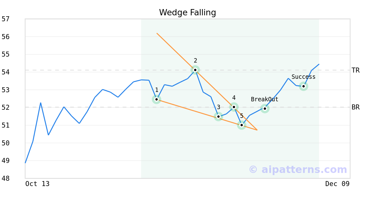 On November 20, 2025, A.I.dvisor detected a Wedge Falling Pattern (Bullish) for Bank of America Corp (BAC, $51.00). On November 24, 2025, A.I.dvisor confirmed the Bullish pattern, setting a target price of $54.11. 8 days later, on December 02, 2025, BAC reached the target price resulting in a for traders who took a long position in the stock.