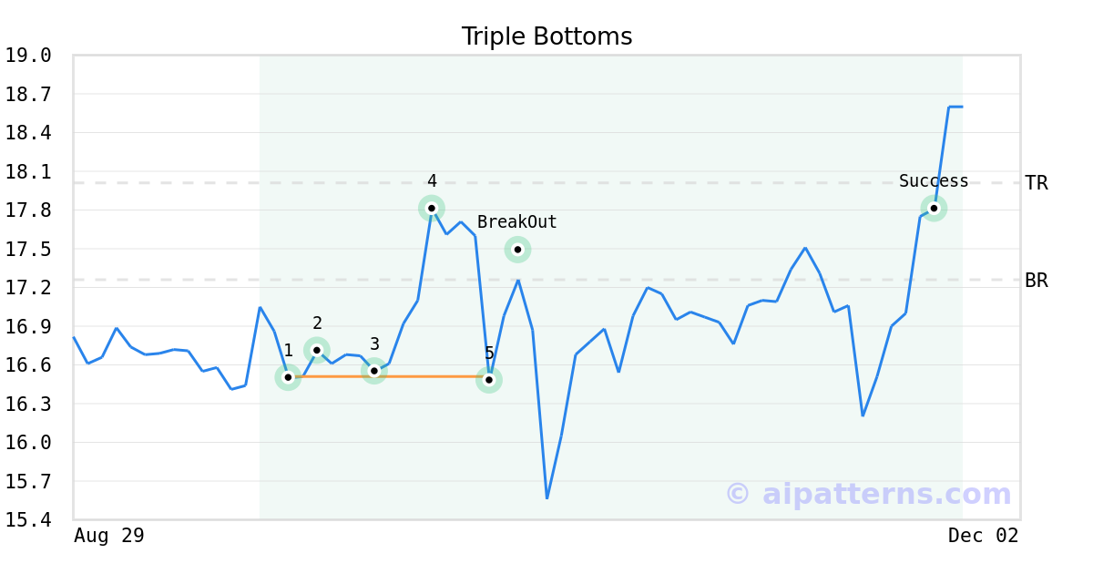 On October 10, 2025, A.I.dvisor detected a Triple Bottoms Pattern (Bullish) for Banc of California (BANC, $16.48). On October 14, 2025, A.I.dvisor confirmed the Bullish pattern, setting a target price of $18.01. 41 days later, on November 24, 2025, BANC reached the target price resulting in a for traders who took a long position in the stock.