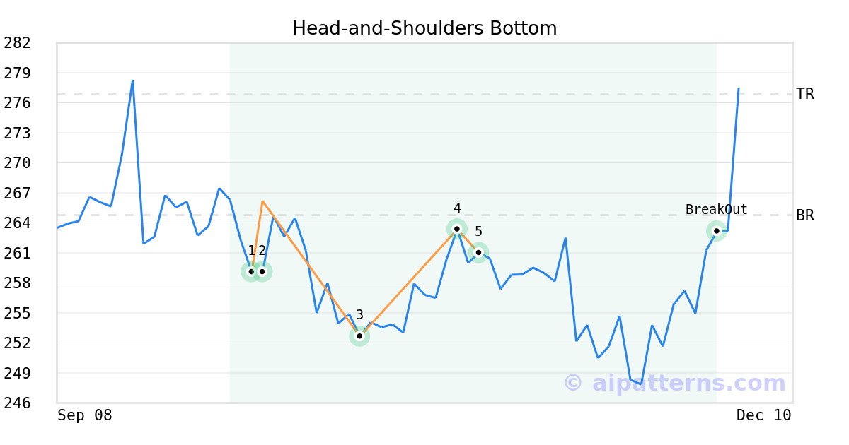 On October 31, 2025, A.I.dvisor detected a Head-and-Shoulders Bottom Pattern (Bullish) for Credicorp Ltd (BAP, $261.00). On December 03, 2025, A.I.dvisor confirmed the Bullish pattern, setting a target price of $276.90. On December 03, 2025, BAP reached the target price resulting in a for traders who took a long position in the stock.