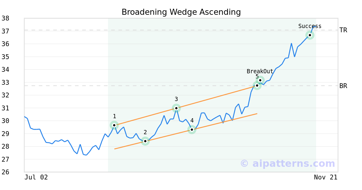 On October 17, 2025, A.I.dvisor detected a Broadening Wedge Ascending Pattern (Bullish) for Banco de ChileAmerican (BCH, $32.74). On October 20, 2025, A.I.dvisor confirmed the Bullish pattern, setting a target price of $37.08. 22 days later, on November 11, 2025, BCH reached the target price resulting in a +1 for traders who took a long position in the stock.