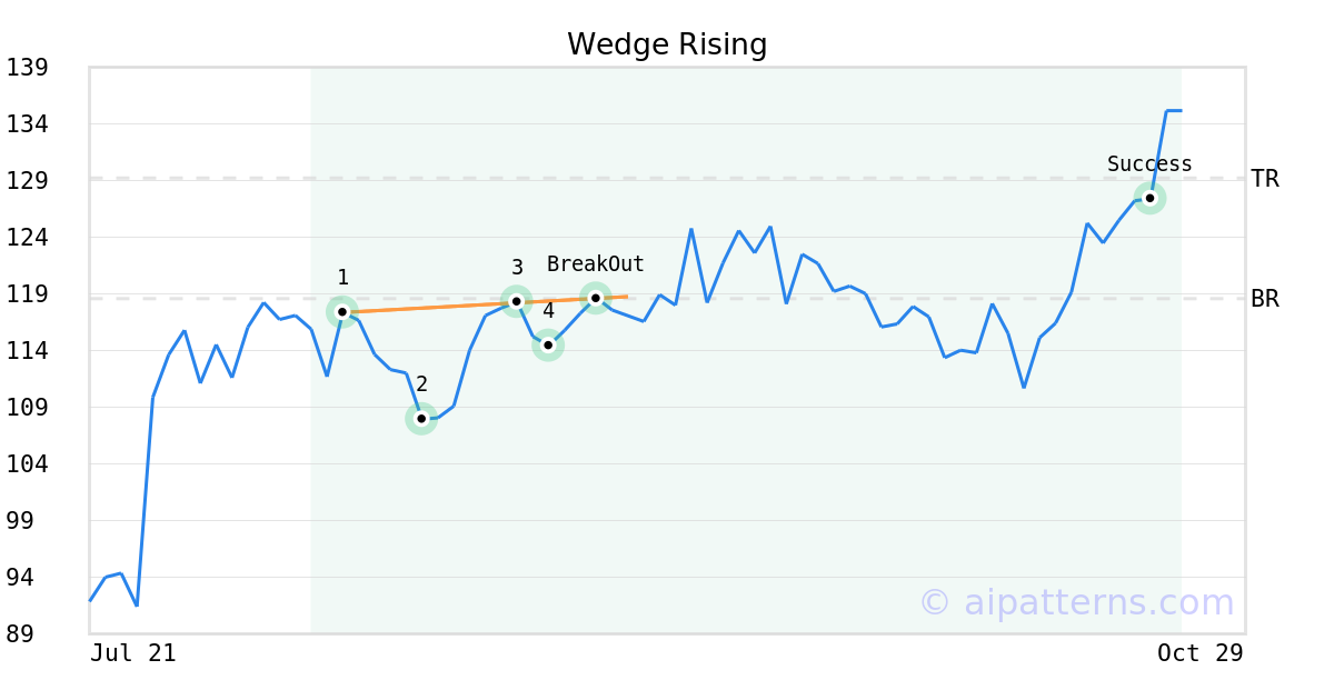 On September 04, 2025, A.I.dvisor detected a Wedge Rising Pattern (Bullish) for Bel Fuse (BELFA, $118.52). On September 04, 2025, A.I.dvisor confirmed the Bullish pattern, setting a target price of $129.22. 48 days later, on October 22, 2025, BELFA reached the target price resulting in a for traders who took a long position in the stock.