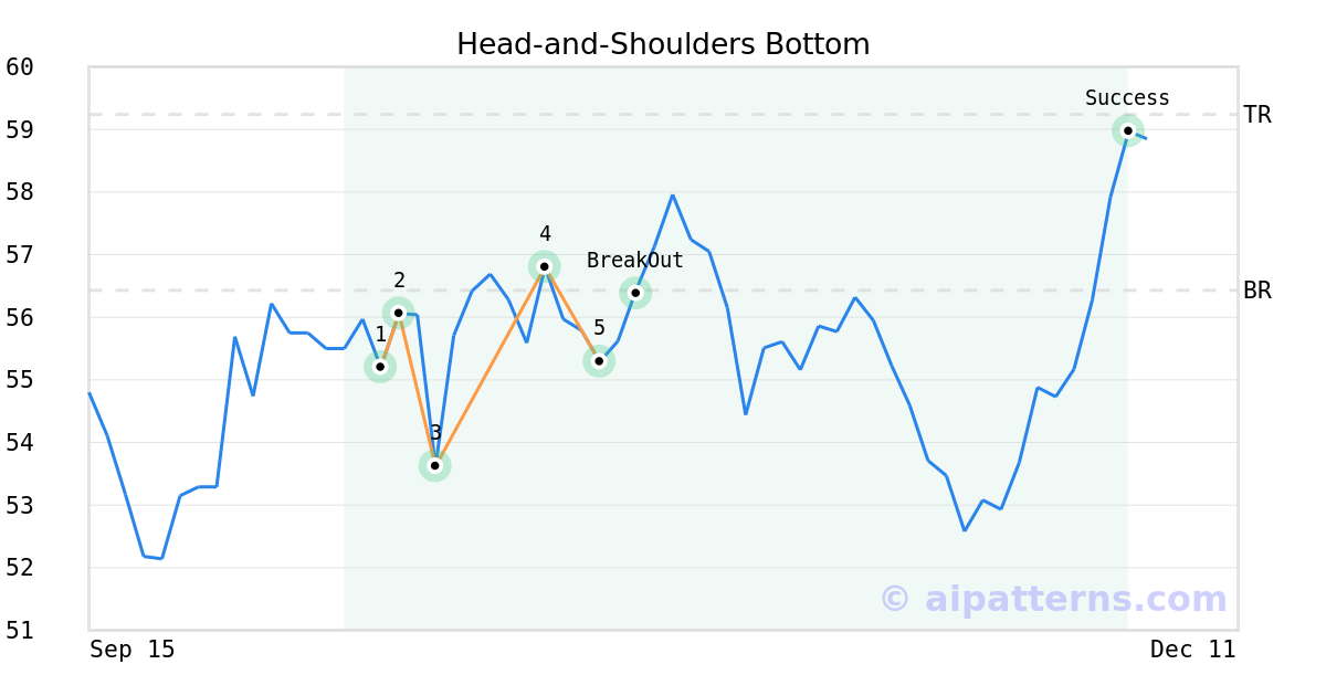 On October 23, 2025, A.I.dvisor detected a Head-and-Shoulders Bottom Pattern (Bullish) for BHP Group Limited (BHP, $55.29). On October 27, 2025, A.I.dvisor confirmed the Bullish pattern, setting a target price of $59.24. 38 days later, on December 04, 2025, BHP reached the target price resulting in a for traders who took a long position in the stock.