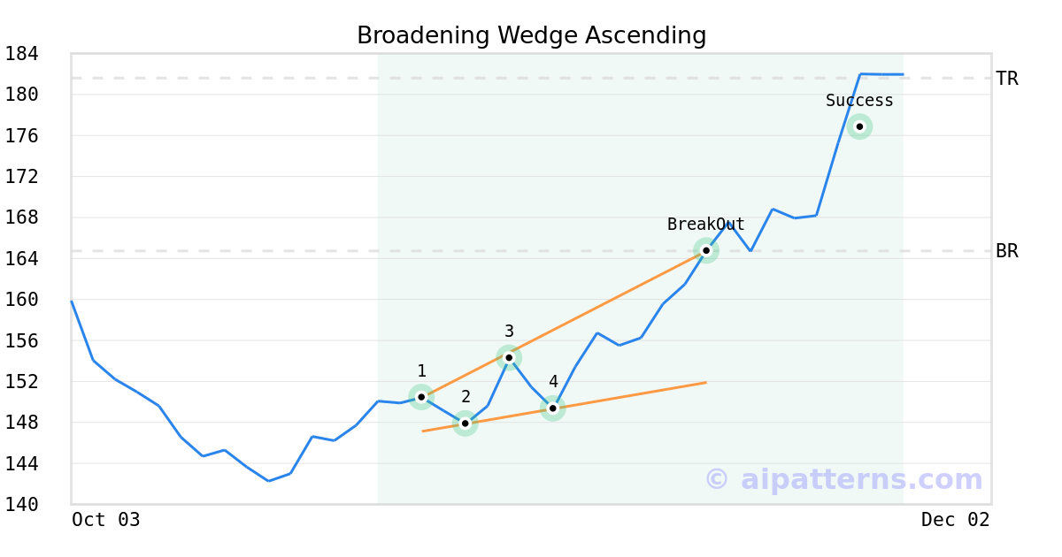 On November 13, 2025, A.I.dvisor detected a Broadening Wedge Ascending Pattern (Bullish) for Biogen (BIIB, $164.73). On November 13, 2025, A.I.dvisor confirmed the Bullish pattern, setting a target price of $181.60. 11 days later, on November 24, 2025, BIIB reached the target price resulting in a for traders who took a long position in the stock.