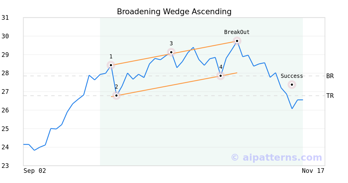 On October 27, 2025, A.I.dvisor detected a Broadening Wedge Ascending Pattern (Bearish) for Siren Nasdaq NexGen Economy ETF (BLCN, $29.73). On October 27, 2025, A.I.dvisor confirmed the Bearish pattern, setting a target price of the stock. On November 10, 2025, the stock hit the target price of $26.78 – resulting in a gain for traders who shorted the stock on the pattern detection date.