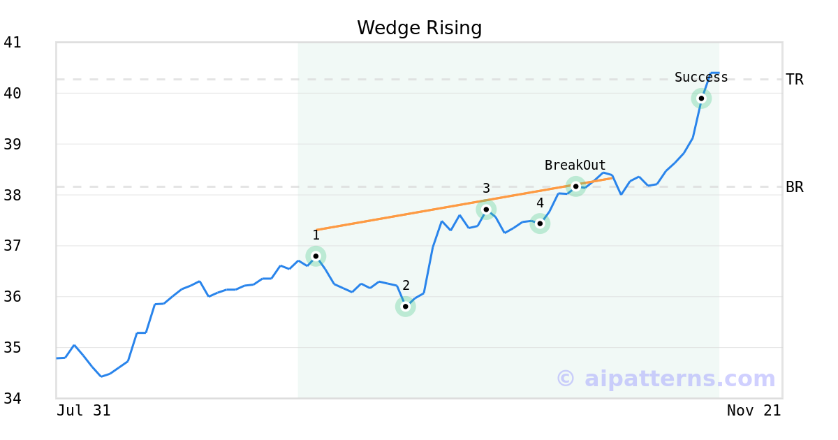 On October 22, 2025, A.I.dvisor detected a Wedge Rising Pattern (Bullish) for Blackrock Health Sciences Trust (BME, $38.16). On October 22, 2025, A.I.dvisor confirmed the Bullish pattern, setting a target price of $40.27. 20 days later, on November 11, 2025, BME reached the target price resulting in a for traders who took a long position in the stock.