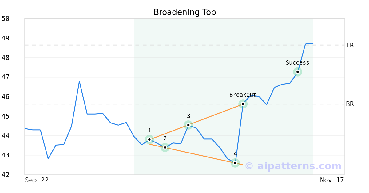 On October 30, 2025, A.I.dvisor detected a Broadening Top Pattern (Bullish) for Bristol-Myers Squibb Co (BMY, $45.62). On October 30, 2025, A.I.dvisor confirmed the Bullish pattern, setting a target price of $48.64. 11 days later, on November 10, 2025, BMY reached the target price resulting in a for traders who took a long position in the stock.