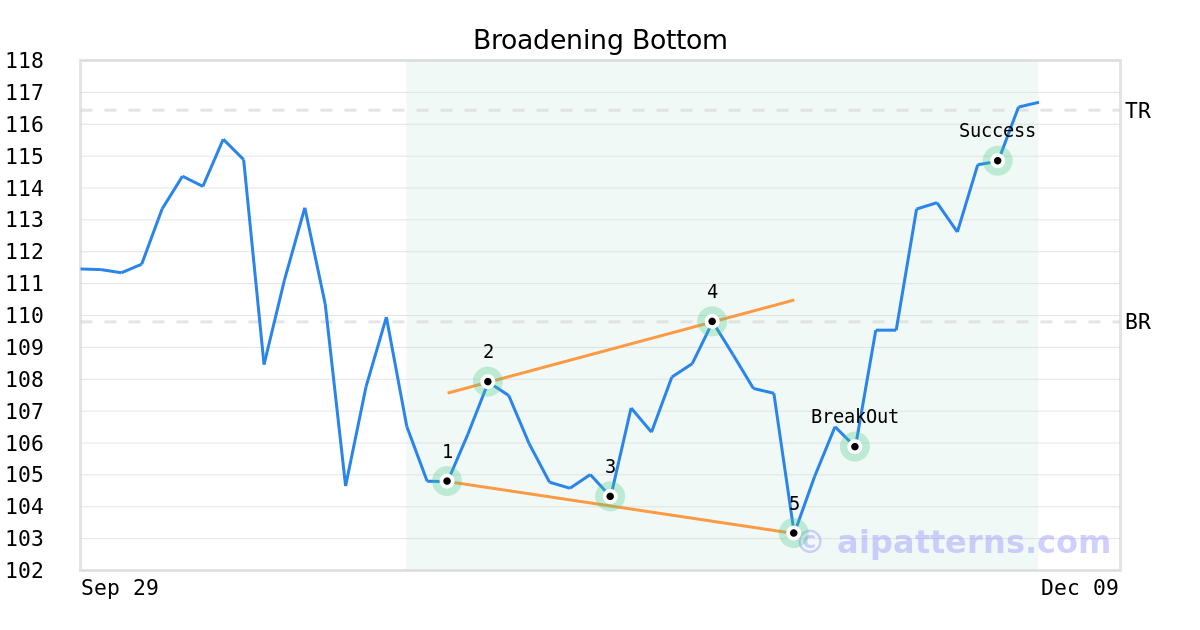 On November 17, 2025, A.I.dvisor detected a Broadening Bottom Pattern (Bullish) for BOK Financial Corp (BOKF, $103.16). On November 20, 2025, A.I.dvisor confirmed the Bullish pattern, setting a target price of $116.44. 12 days later, on December 02, 2025, BOKF reached the target price resulting in a +1 for traders who took a long position in the stock.