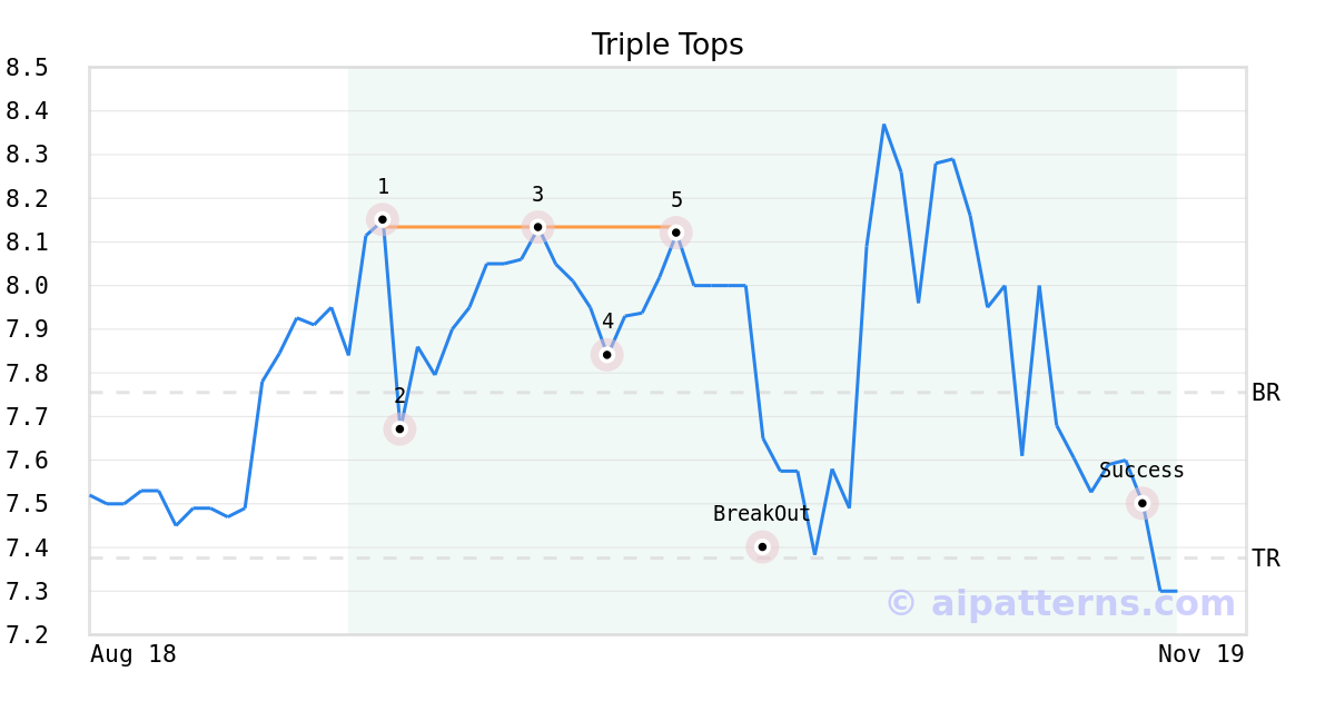 On October 06, 2025, A.I.dvisor detected a Triple Tops Pattern (Bearish) for Bridgford Foods Corp (BRID, $8.12). 7 days later, on October 13, 2025, A.I.dvisor confirmed the Bearish pattern, setting a target price of the stock. On November 12, 2025, the stock hit the target price of $7.38 – resulting in a gain for traders who shorted the stock on the pattern detection date.