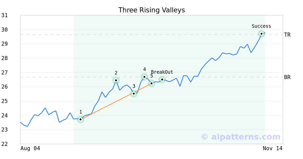 On September 25, 2025, A.I.dvisor detected a Three Rising Valleys Pattern (Bullish) for Banco Santander-Chile (BSAC, $26.23). On September 30, 2025, A.I.dvisor confirmed the Bullish pattern, setting a target price of $29.65. 38 days later, on November 07, 2025, BSAC reached the target price resulting in a +1 for traders who took a long position in the stock.