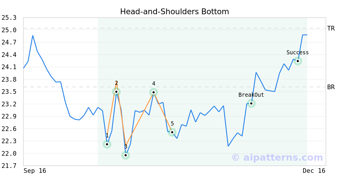 On October 30, 2025, A.I.dvisor detected a Head-and-Shoulders Bottom Pattern (Bullish) for First Busey Corp (BUSE, $22.51). On November 24, 2025, A.I.dvisor confirmed the Bullish pattern, setting a target price of $25.04. 15 days later, on December 09, 2025, BUSE reached the target price resulting in a for traders who took a long position in the stock.