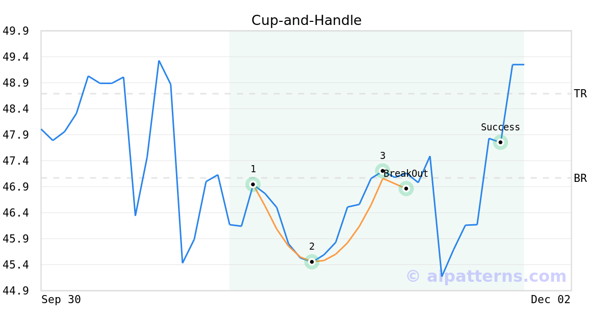 On November 12, 2025, A.I.dvisor detected a Cup-and-Handle Pattern (Bullish) for Cathay General Bancorp (CATY, $46.86). On November 12, 2025, A.I.dvisor confirmed the Bullish pattern, setting a target price of $48.69. 12 days later, on November 24, 2025, CATY reached the target price resulting in a for traders who took a long position in the stock.