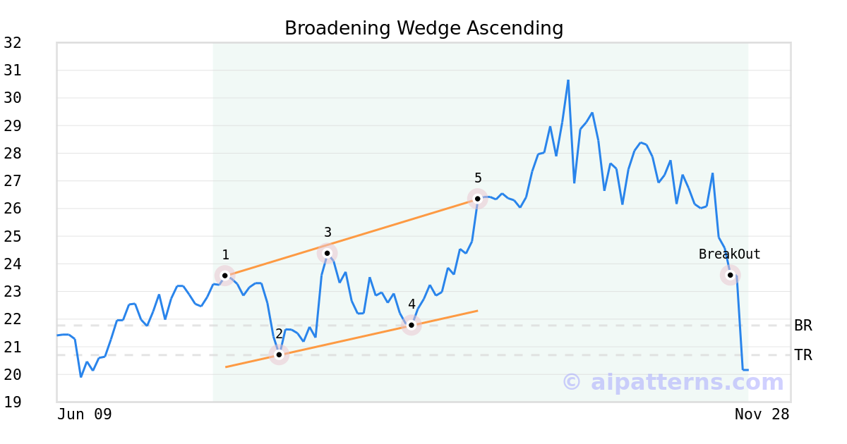 On September 18, 2025, A.I.dvisor detected a Broadening Wedge Ascending Pattern (Bearish) for CEVA (CEVA, $26.34). 60 days later, on November 17, 2025, A.I.dvisor confirmed the Bearish pattern, setting a target price of the stock. On November 17, 2025, the stock hit the target price of $20.70 – resulting in a +1 gain for traders who shorted the stock on the pattern detection date.