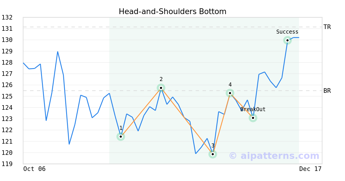On December 02, 2025, A.I.dvisor detected a Head-and-Shoulders Bottom Pattern (Bullish) for Cullen/Frost Bankers (CFR, $123.07). On December 02, 2025, A.I.dvisor confirmed the Bullish pattern, setting a target price of $131.15. 8 days later, on December 10, 2025, CFR reached the target price resulting in a for traders who took a long position in the stock.
