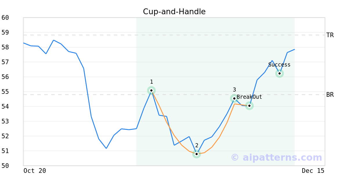 On December 02, 2025, A.I.dvisor detected a Cup-and-Handle Pattern (Bullish) for Carlyle Group (The) (CG, $54.04). On December 02, 2025, A.I.dvisor confirmed the Bullish pattern, setting a target price of $58.82. 6 days later, on December 08, 2025, CG reached the target price resulting in a for traders who took a long position in the stock.