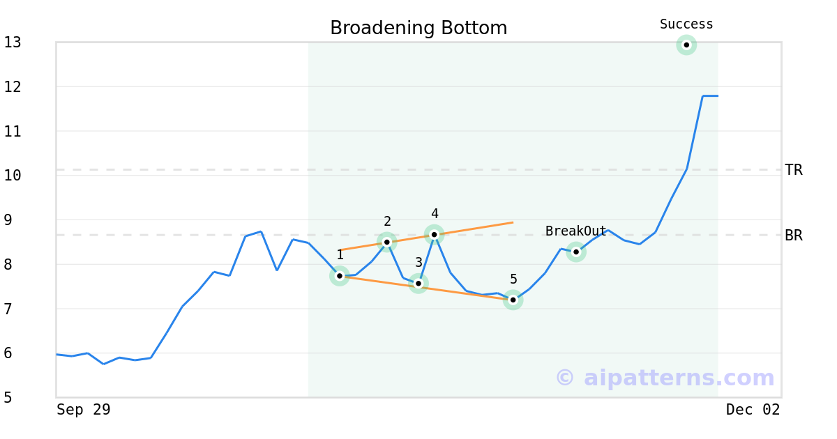 On November 07, 2025, A.I.dvisor detected a Broadening Bottom Pattern (Bullish) for Cullinan Therapeutics (CGEM, $7.19). On November 13, 2025, A.I.dvisor confirmed the Bullish pattern, setting a target price of $10.13. 11 days later, on November 24, 2025, CGEM reached the target price resulting in a +7 for traders who took a long position in the stock.