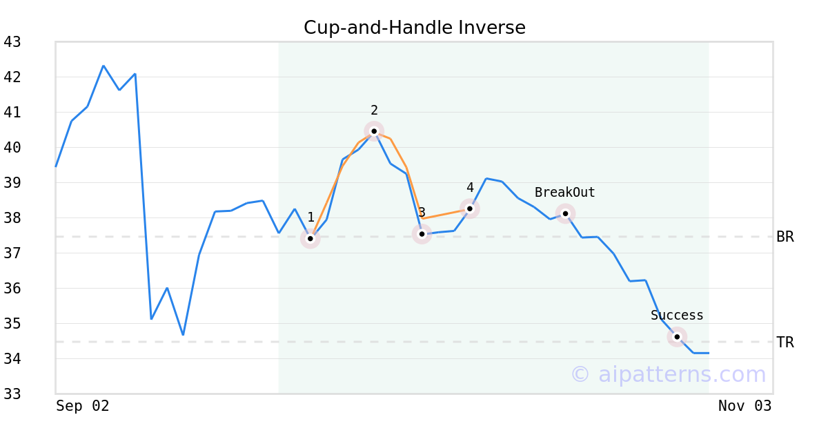 On October 08, 2025, A.I.dvisor detected a Cup-and-Handle Inverse Pattern (Bearish) for Chewy (CHWY, $38.25). 8 days later, on October 16, 2025, A.I.dvisor confirmed the Bearish pattern, setting a target price of the stock. On October 27, 2025, the stock hit the target price of $34.48 – resulting in a gain for traders who shorted the stock on the pattern detection date.