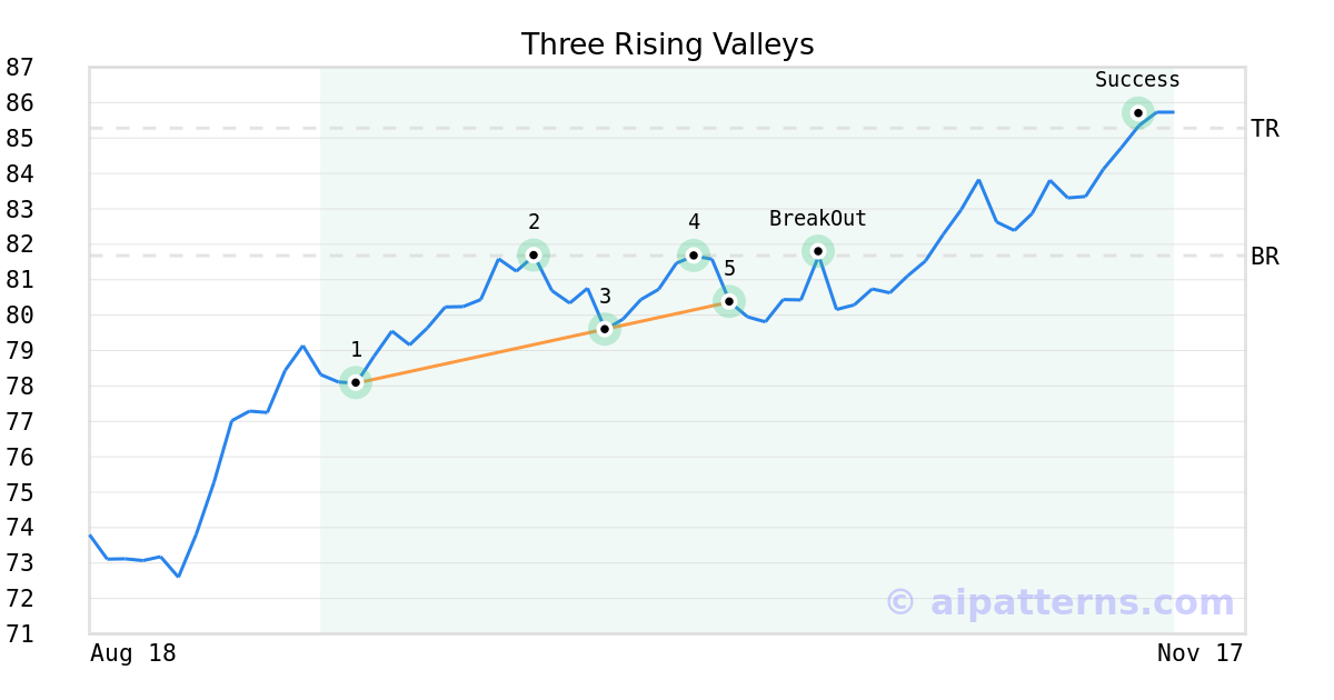 On October 08, 2025, A.I.dvisor detected a Three Rising Valleys Pattern (Bullish) for Canadian Imperial Bank of Commerce (CM, $80.37). On October 15, 2025, A.I.dvisor confirmed the Bullish pattern, setting a target price of $85.28. 26 days later, on November 10, 2025, CM reached the target price resulting in a for traders who took a long position in the stock.