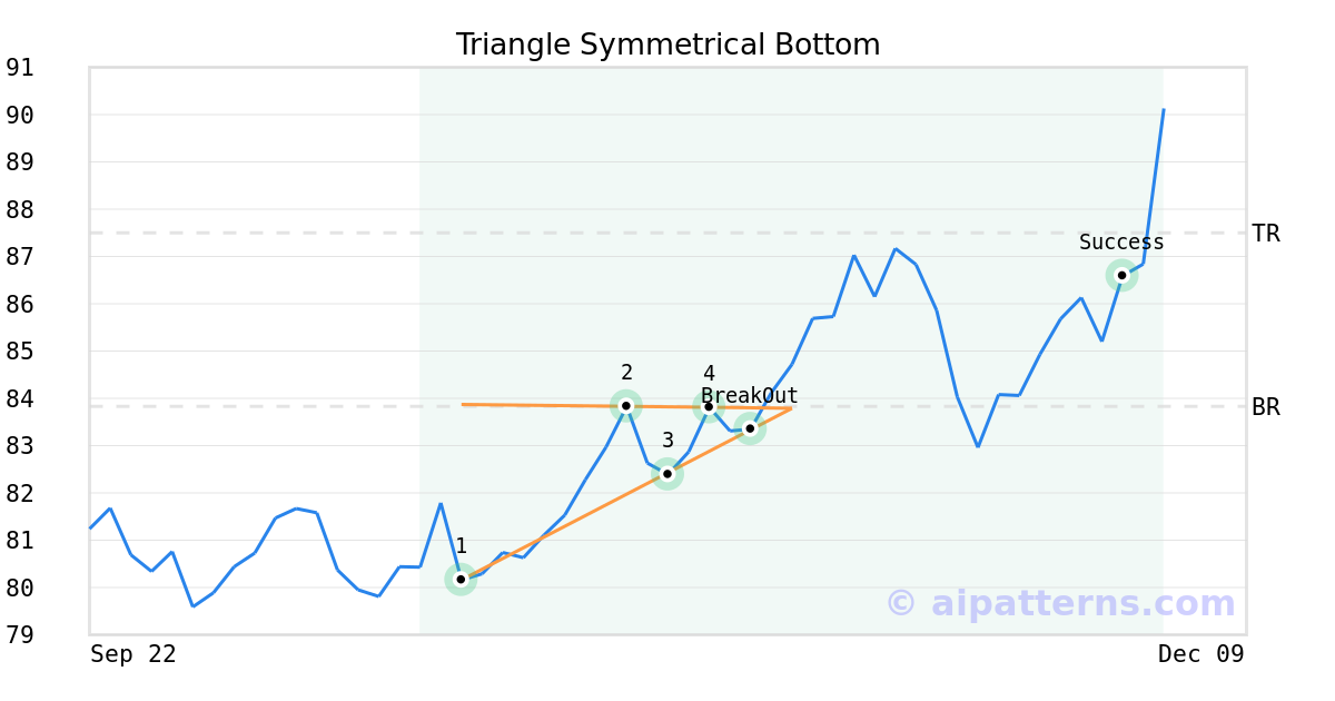 On November 05, 2025, A.I.dvisor detected a Triangle Symmetrical Bottom Pattern (Bullish) for Canadian Imperial Bank of Commerce (CM, $83.35). On November 05, 2025, A.I.dvisor confirmed the Bullish pattern, setting a target price of $87.50. 27 days later, on December 02, 2025, CM reached the target price resulting in a for traders who took a long position in the stock.