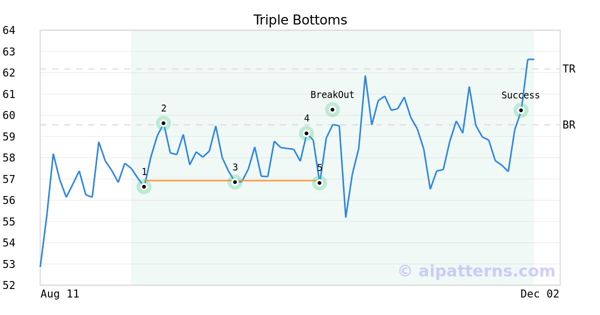 On October 10, 2025, A.I.dvisor detected a Triple Bottoms Pattern (Bullish) for Commercial Metals Company (CMC, $56.80). On October 14, 2025, A.I.dvisor confirmed the Bullish pattern, setting a target price of $62.18. 41 days later, on November 24, 2025, CMC reached the target price resulting in a for traders who took a long position in the stock.