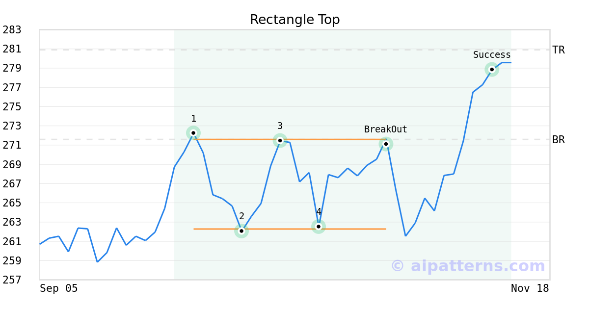 On October 27, 2025, A.I.dvisor detected a Rectangle Top Pattern (Bullish) for CME Group (CME, $271.09). On October 27, 2025, A.I.dvisor confirmed the Bullish pattern, setting a target price of $280.91. 15 days later, on November 11, 2025, CME reached the target price resulting in a for traders who took a long position in the stock.