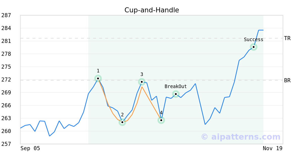 On October 16, 2025, A.I.dvisor detected a Cup-and-Handle Pattern (Bullish) for CME Group (CME, $262.51). On October 21, 2025, A.I.dvisor confirmed the Bullish pattern, setting a target price of $281.64. 22 days later, on November 12, 2025, CME reached the target price resulting in a for traders who took a long position in the stock.