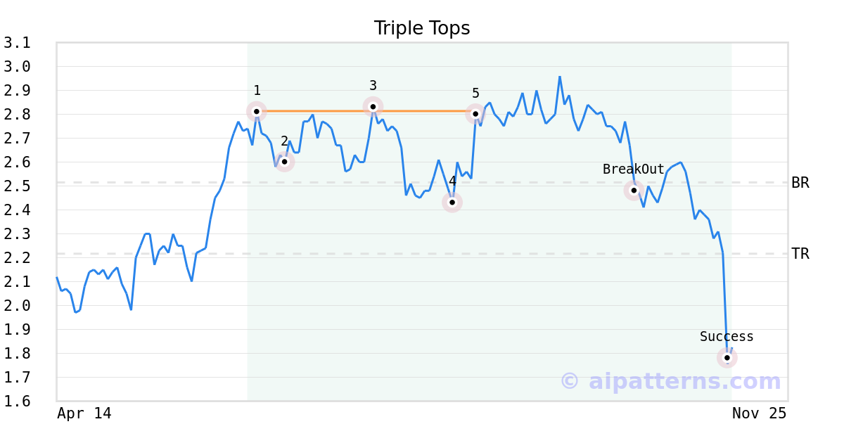 On August 22, 2025, A.I.dvisor detected a Triple Tops Pattern (Bearish) for Conduent (CNDT, $2.80). 49 days later, on October 10, 2025, A.I.dvisor confirmed the Bearish pattern, setting a target price of the stock. On November 07, 2025, the stock hit the target price of $2.22 – resulting in a +3 gain for traders who shorted the stock on the pattern detection date.