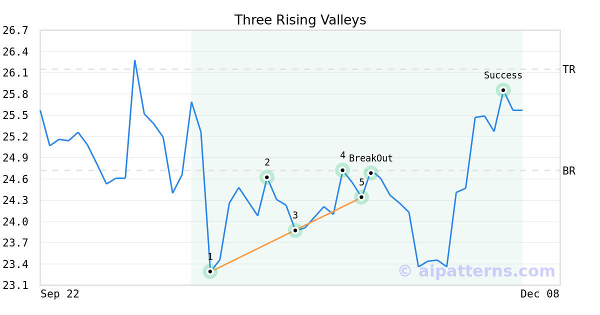 On November 07, 2025, A.I.dvisor detected a Three Rising Valleys Pattern (Bullish) for ConnectOne Bancorp (CNOB, $24.34). On November 10, 2025, A.I.dvisor confirmed the Bullish pattern, setting a target price of $26.15. 21 days later, on December 01, 2025, CNOB reached the target price resulting in a for traders who took a long position in the stock.