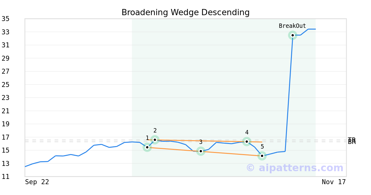 On November 04, 2025, A.I.dvisor detected a Broadening Wedge Descending Pattern (Bullish) for Cogent Biosciences (COGT, $14.13). On November 10, 2025, A.I.dvisor confirmed the Bullish pattern, setting a target price of $16.57. On November 10, 2025, COGT reached the target price resulting in a +12 for traders who took a long position in the stock.